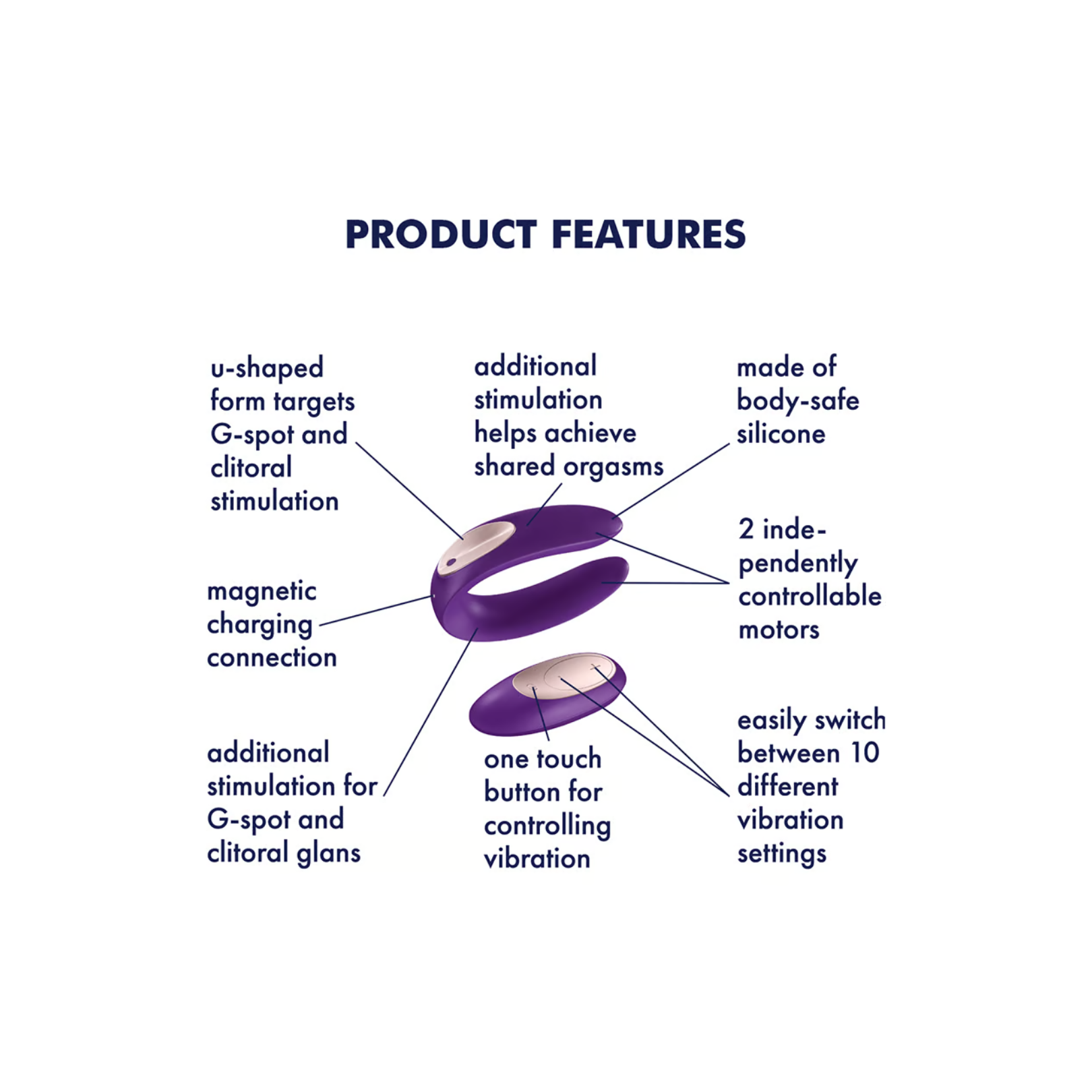 El Satisfyer Double Plus Remote está diseñado para parejas que desean intensificar el placer durante las relaciones sexuales. Su diseño en forma de "U" proporciona estimulación dual tanto para el usuario como para su pareja. Con 10 modos de vibración y un control remoto incluido, es fácil de usar y personalizar. Fabricado con silicona suave y flexible, es completamente resistente al agua y recargable mediante USB.